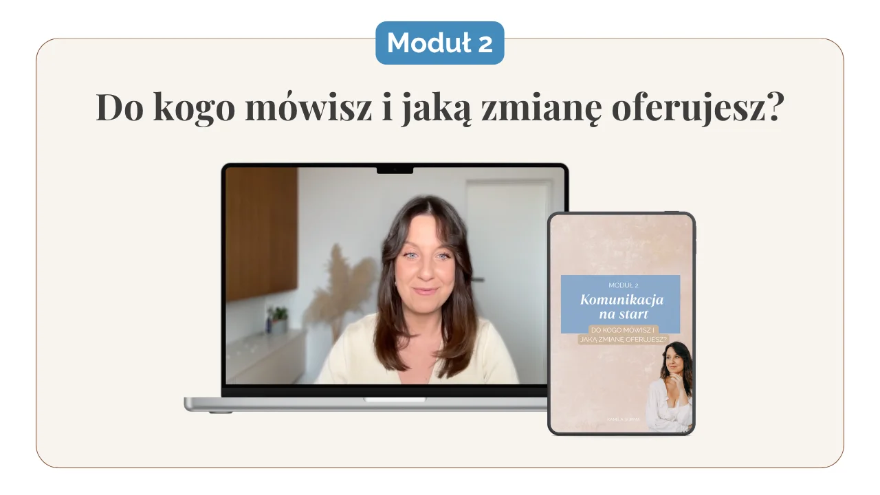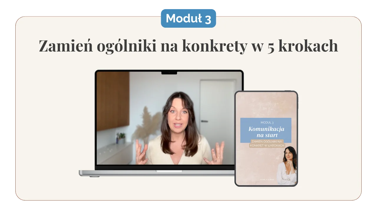 W tym module przejdziesz przez 5-etapowy proces, dzięki któremu zamienisz ogólne komunikaty na konkretne, obrazowe przykłady z życia Twojej klientki.
